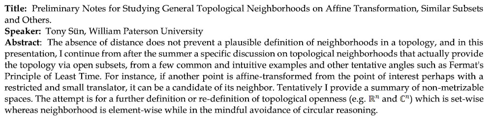 In Fall 2024 I took Computational Topology, Mathematical Logic (through audits at CUNY), and Mathematics of Finance courses, while instructing the single-variable calculus session at Yeshiva; throughout the week I sometimes looked at the mathematics seminars at CUNY-Graduate Center. In Summer 2024 I was studying a 2023 workshop on Structural Equation Modeling while taking Intro to American Politics and Legal and Ethical Environment of Business along with a few vacational and academic visits to the Science Museum of Long Island (Manhasset, N.Y.), downtown Princeton and University, N.J., University of Lynchburg and Liberty University [.png], VA, and the New England area [.png] respectively. Attended MAA's OPEN Math workshop on inclusive, active learning for the week of June 3rd as well as attending Team-Based Inquiry Learning for the week of June 24th. Scheduled to tentatively teach MAT 1412: Calculus I during the July semi-asynchronous session. From July to August I was also teaching/hosting a (homeschooling) course for adolescent literacy on dialogic reading, on an important category of texts which would help adolescent as well as adult/senior or second-language learners of English contextualize much conversationally, both in oral and written forms.
